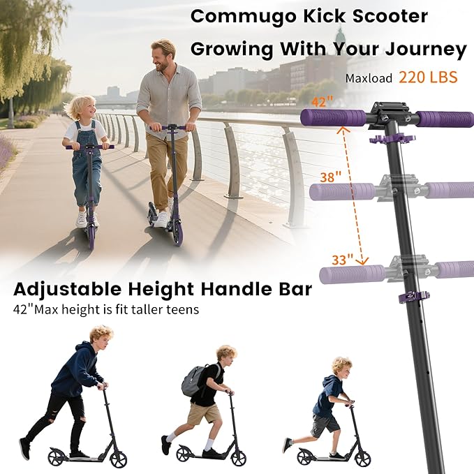 - Height Adjustable: Supports 3.9 FT - 5.9 FT height riders. The handlebar is adjustable to 4 height options (31”, 33.8”, 36.4”, 39”). Note: If you're an adult, it's best not to be taller than 5.9FT (180cm), or the scooter may feel too small