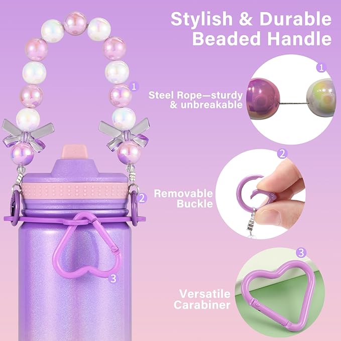 - 【Stylish & Durable Beaded Handle】The handle is crafted from colorful bead string and reinforced steel wire—beautiful like a charm bracelet, yet strong enough for daily adventures, playdates, or school use. Also includes a heart-shaped carabiner for clipping onto backpacks or lunch bags (Accessories are inside the bottle)