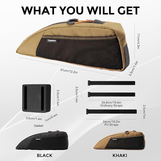 - Designed for Cycling: The bike storage bag features a streamlined design. The entire shape is both narrow and long, which not only increases storage space but also ensures that your legs won't touch the bag when you ride freely. The net pocket design on both sides of the cycling accessories makes it more convenient for you to take it out. The bottom of the bike frame bag is equipped with a PP support plate, which helps to stabilize the bag and prevent it from deforming.