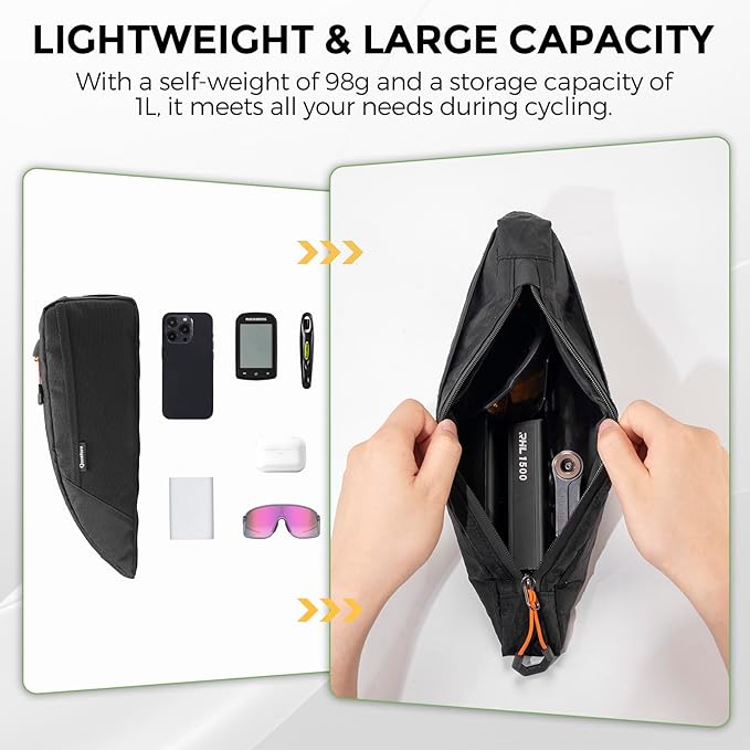 - Lightweight & Large Capacity: The top tube bike bag for cycling while ensuring lightness, also offers a large capacity of 1L, which can store a mobile phone, cycling glasses, energy gel, headphones, power bank, wallet, cycling gloves, bicycle repair tools, etc.