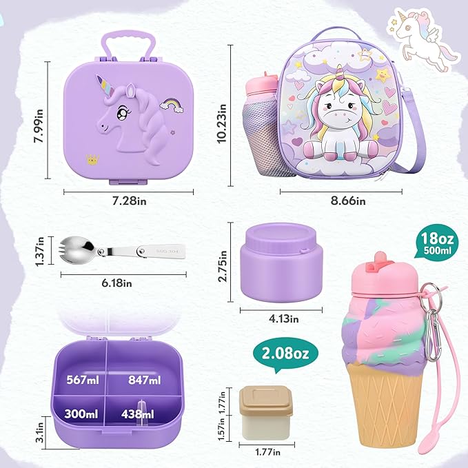 - 🦄Aimsnk Magic Bento Lunch Box Set for School:This bento box set contains: 1*3D Magic lunch box, 1*3D Magic insulated lunch bag, 1*12oz soup thermo, 1*salad dressing container, 1*food divider (change 4or5 compartment) and a set of cutlery (spoon). lunch box container adopts a single lock buckle design, making it easier for children to open, the 12-ounce vacuum-insulated soup box also adopts a threaded rotating opening design, so you don't have to worry about your child not being able to open it.
