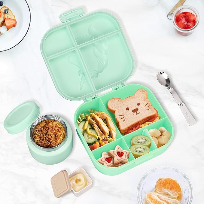 - 🌈Food Grade Materials: Our unique magic lunch box will be the coolest gift you can give your child for the new term! Our lunch boxes and insulated thermo food jar are made of food grade materials, which not only seal and prevent leakage, but also effectively prevent odors,Four sealed compartments can effectively prevent food from cross flavoring each other.food safety is the original intention of our product development.