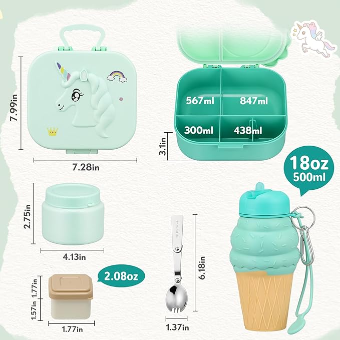 - 🦄Aimsnk Magic Bento Lunch Box Set for School:This bento box set contains: 1*3D Magic lunch box, 1*3D Magic insulated lunch bag, 1*Green12oz soup thermo, 1*salad dressing container, 1*food divider (change 4or5 compartment) and a set of cutlery (spoon). lunch box container adopts a single lock buckle design, making it easier for children to open, the 12-ounce vacuum-insulated soup box also adopts a threaded rotating opening design, so you don't have to worry about your child not being able to open it.