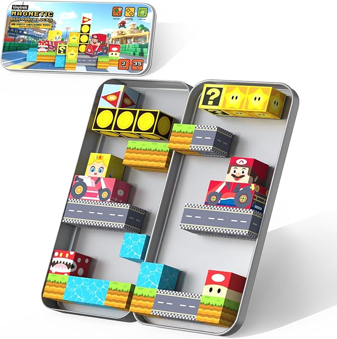- All-in-One Travel Magnetic Tiles with Iron Box: This 35-piece mini magnet blocks set comes in a sturdy, portable iron storage box that doubles as a magnetic building baseplate. It is the perfect travel toys for toddlers on planes, trains, cars or in restaurants