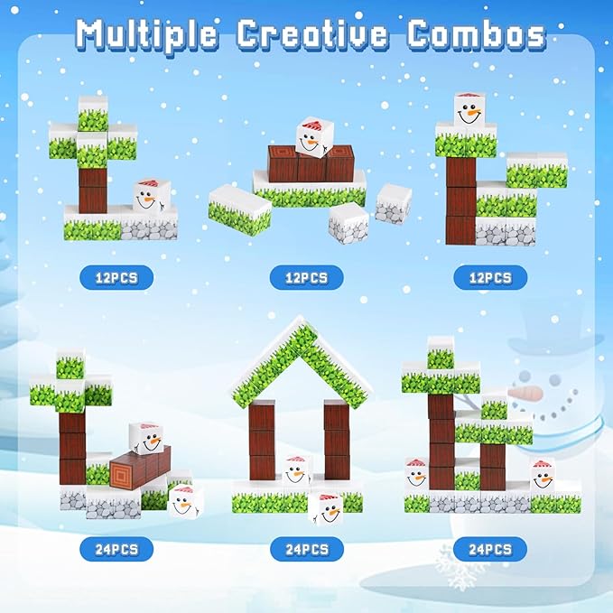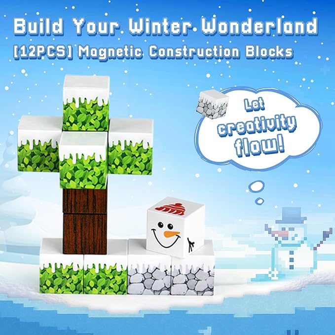 - 【Build a Winter Wonderland】: This magnetic building block set includes 12 high-quality pixel-style cubes that snap together to form winter scenes. With endless building possibilities, kids can use their imagination to create custom structures