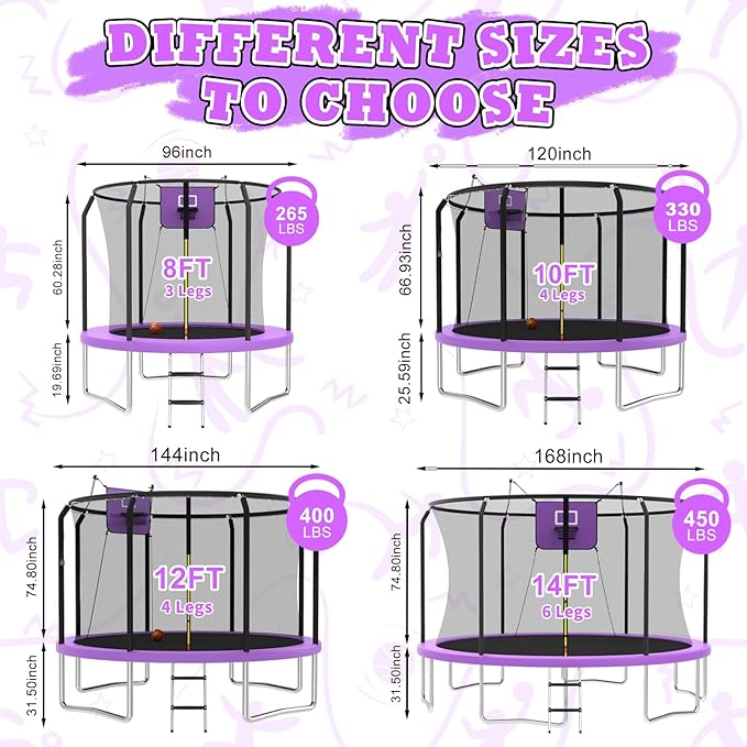 - Durable & Easy to Install: Our trampoline constructed with a galvanized steel frame and premium powder-coated T-connectors to withstand all weather conditions while supporting up to 450 lbs. The unique screwless clip design reduces assembly time by 25% compared to traditional screw installations, letting you quickly set up your trampoline outdoor
