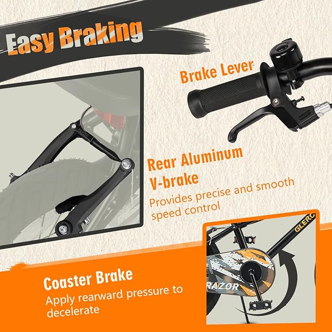 - 【DUAL BRAKE SYSTEM】This kids bicycle is equipped with coaster brake and front V-brake, providing reliable braking performance, making it easy for even beginners to control the speed of the bike, which can ensure a safe ride and help cycling learning.