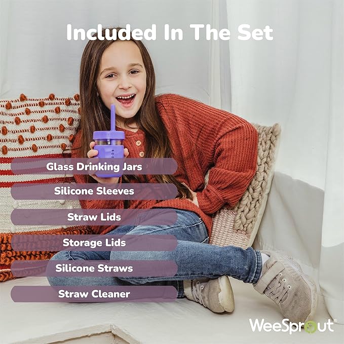 WeeSprout Glass Cups With Lids & Straws, Spill-Resistant Smoothie Jars for Toddlers & Kids, Baby Food Storage & Snack Containers, XL Silicone Straw, Easy-grip Sleeves, Set of Four, Dishwasher Safe