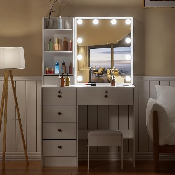 - 【Stylish & Functional Vantiy Desk】 This dressing table with mirror combines functionality and style to create a delightful addition to your bedroom or dressing room. Featuring 6 drawers and shelves, it offers ample space for your makeup, jewelry, and other essentials. Hollywood style lighted mirror ensure optimal lighting for flawless makeup application
