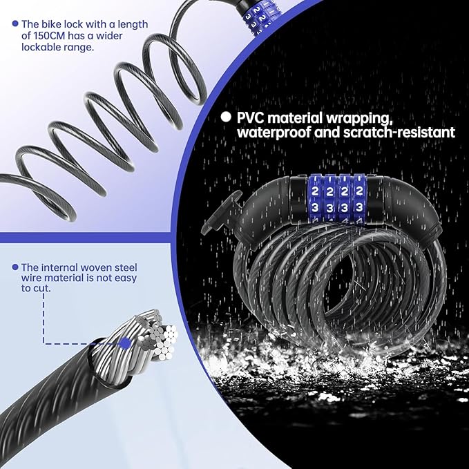 - KEEP YOUR BIKE SAFE: Smart 4-Digit Resettable cable lock, Made of high strength braided steel wire and anti-rust zinc alloy, strong cut resistance. PVC coating helps cables lock more durable against hard environment.
