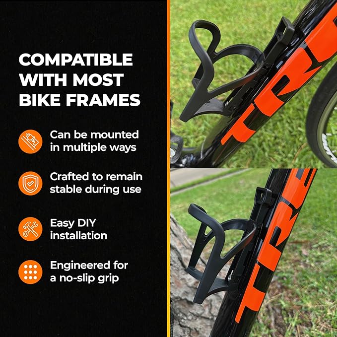 - Hassle-Free Universal Mounting: Easily attach your bottle cage to frames vertically or horizontally. Water Bottle Holder made from reinforced nylon. Weighs less than 25 grams. Bolts Not Included.