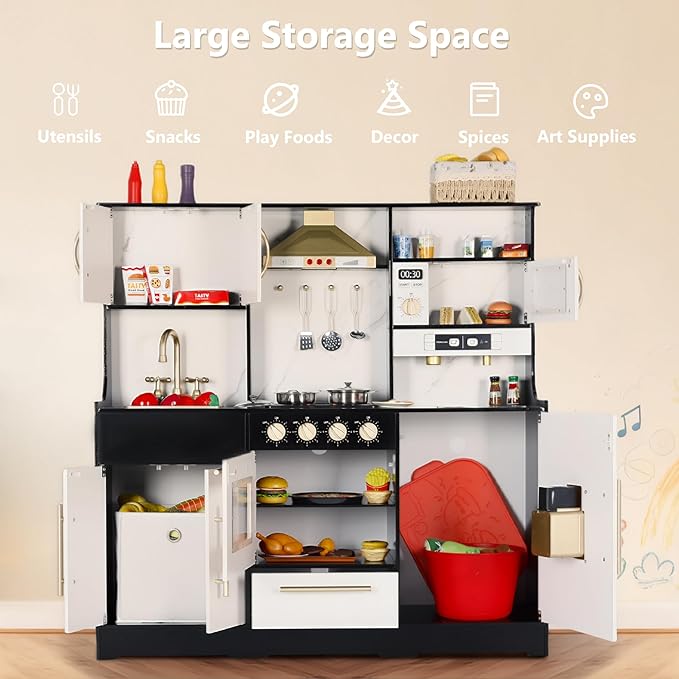 - Realistic & Fully Equipped Play Kitchen: Features a complete kitchen setup with a pretend stove, roaster oven, microwave oven, coffee maker, ice maker, sink with 360° rotatable faucet, rotating knobs and range hood — offering endless hours of immersive cooking fun