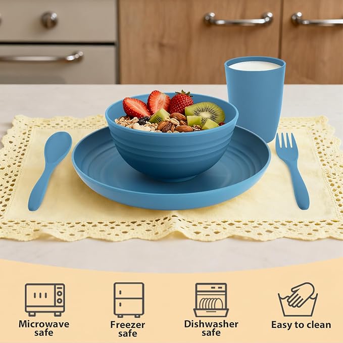 Wheat Straw Dinnerware Sets for 4, Reusable Plastic Dinner Plates, Unbreakable Kids Plates and Bowls Sets 20 PCS, Dishwasher & Microwave Safe Kitchen Camping Dorm Dish Sets- Blue