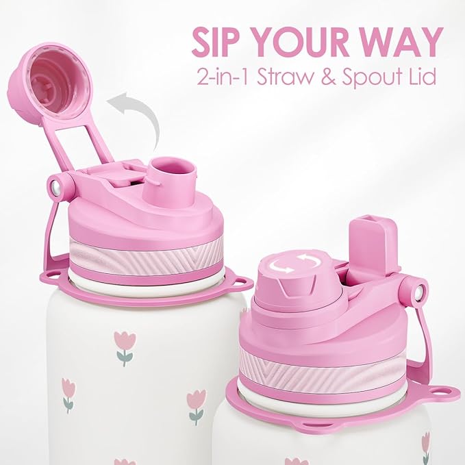 Tulip Stainless Steel Water Bottle with Strap 32oz, Insulated Bottles with Straw and Spout Lid for Gym Sports Travel Outdoor, Gifts for Women Girls Birthday Christmas
