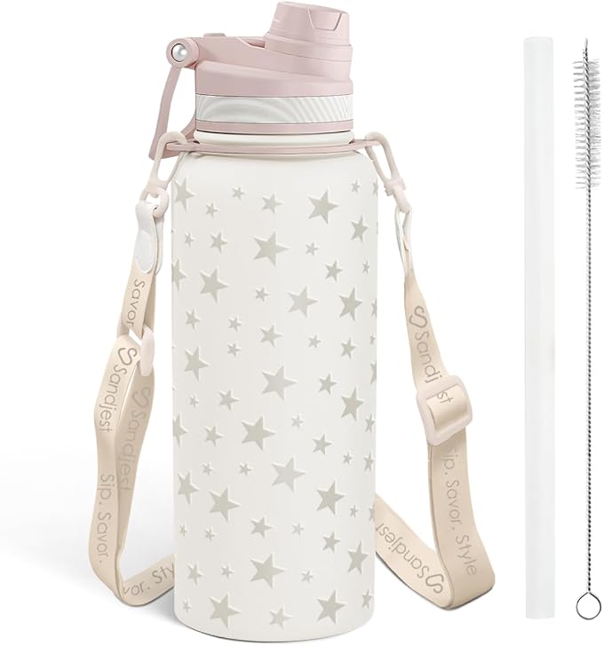 Star and Moon Stainless Steel Water Bottle with Strap 32oz, Insulated Bottles with Straw and Spout Lid for Gym Sports Travel Outdoor, Gifts for Women Girls Birthday Christmas