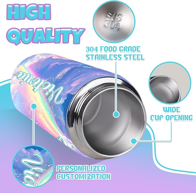 - 【High quality insulation material】 Crafted from food-grade 304 stainless steel and BPA-free, these bottles keep beverages hot for 12 hours and cold for 24 hours. Whether it's hot coffee, warm milk, ice water, or chilled cola, our high-quality materials ensure each drink retains its true flavor. Ensure that everyone can drink warm water while still in school, protecting the physical health of every child. Choose a personalized water bottle tailored just for your child.