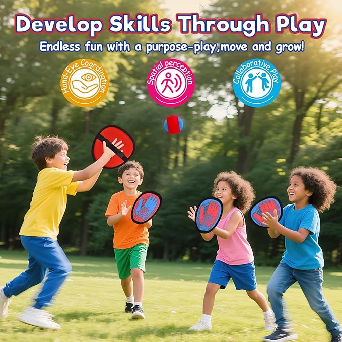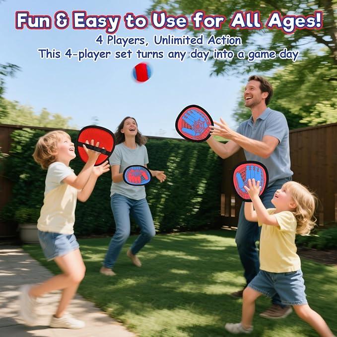 - 【GREAT KIDS OUTDOOR GAMES】Our toss and catch ball game set is a fun outdoor game and family-friendly activity that brings endless fun to kids. This includes 4 colorful balls, 4 sticky paddles, and a portable storage bag, perfect for travel. It’s an excellent choice for beach, backyard, parties, camping, picnics, lawn, playground or parent-child bonding time.