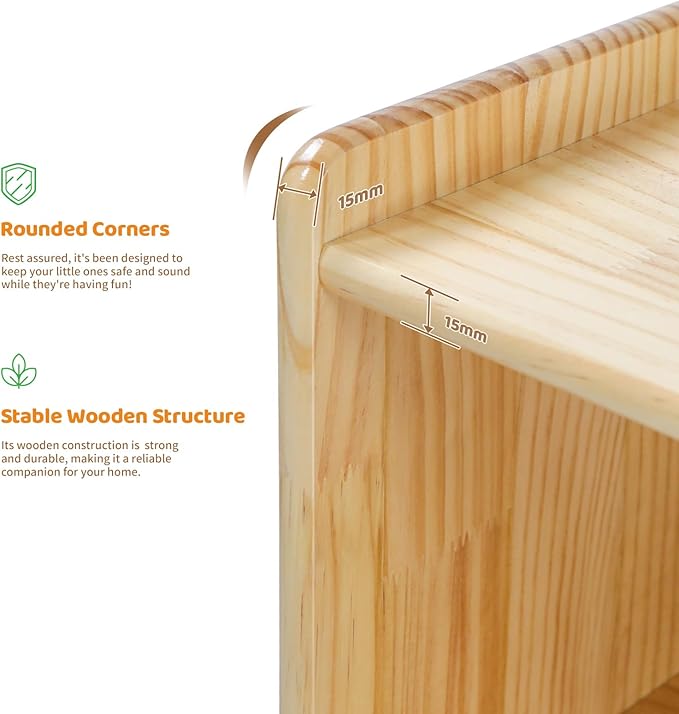 - STURDY AND SAFE STRUCTURE: This toy shelf is lovingly crafted from high-quality pine wood, ensuring it's safe and free from unpleasant odours. The wood colour and grain are really lovely. We've made sure to use an extra-thick base and reinforced screw holes to make it super stable and safe