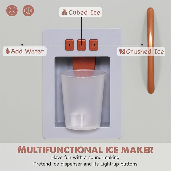 - 🎄 Simulated Design - Play Kitchen with Lights. Oven, cabinet, freezer, refrigerator and microwave doors open and close. Equipped with a variety of realistic cooking utensils,make pretend play more lively and interesting. Create an immersive play experience for children and kids