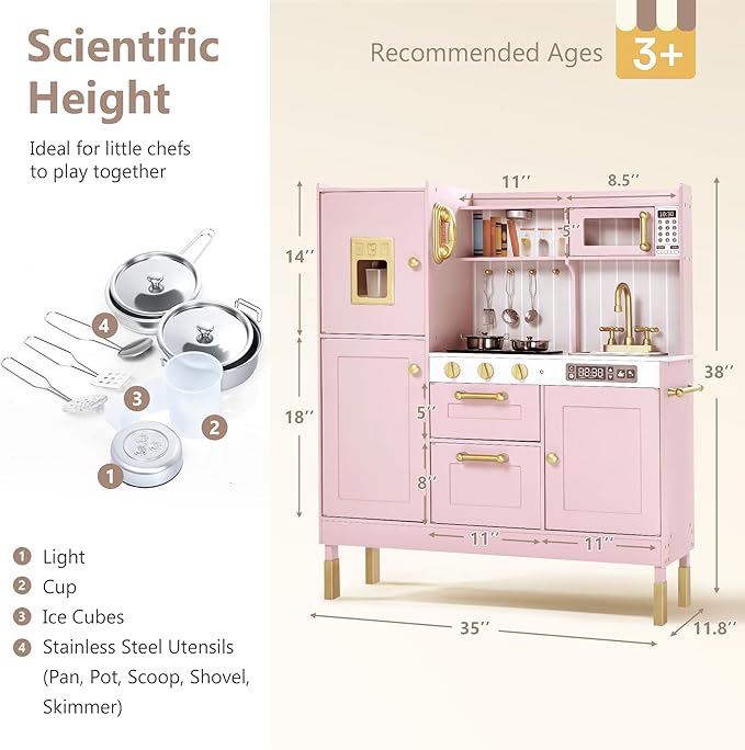 Kinder King Wooden Kids Play Kitchen, Kitchen Playset for Toddler Kid, Play Kitchen Toy Set w/Real Sounds, Pretend Microwave Oven, Ice Maker, Telephone, Gift for Boys Girls Age 3+, Pink