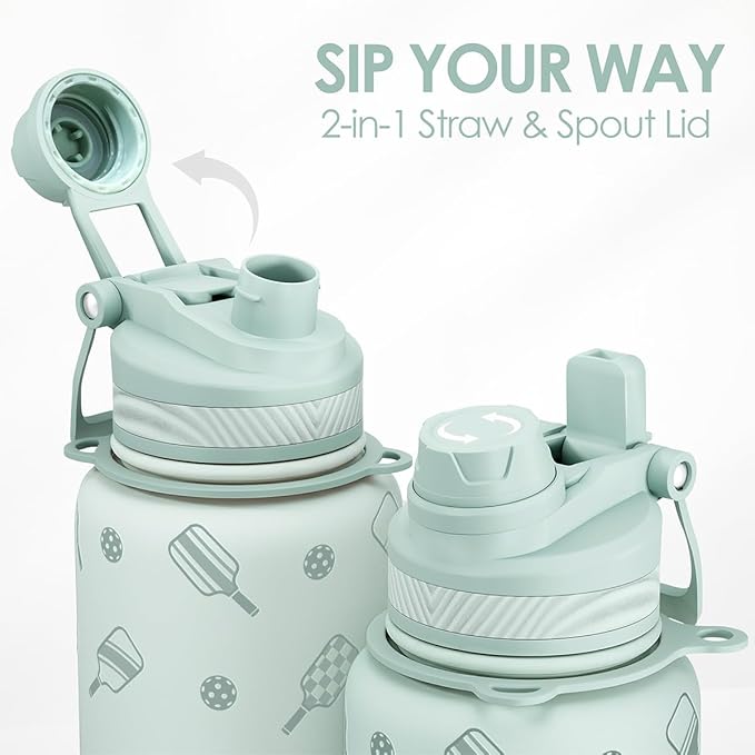 SANDJEST Pickleball Stainless Steel Water Bottle with Strap 32oz, Insulated Bottles with Straw and Spout Lid for Gym Sports Travel Outdoor, Gifts for Women Girls Birthday Christmas