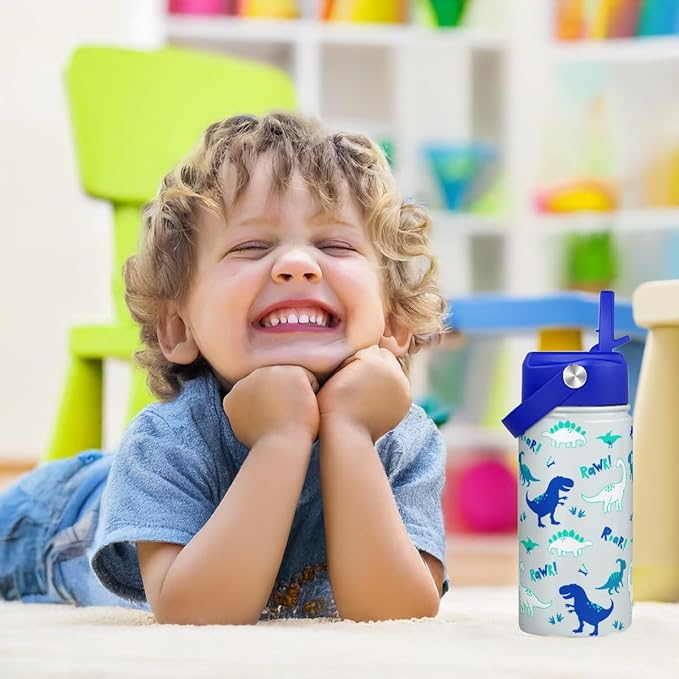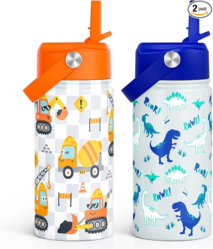 SANDJEST Kid Water Bottle 12oz with Straw Lid - 2-Pack Insulated Stainless Steel Water Bottles for Kids Girls - Travel Cup for School Sports, Construction & Dinosaur