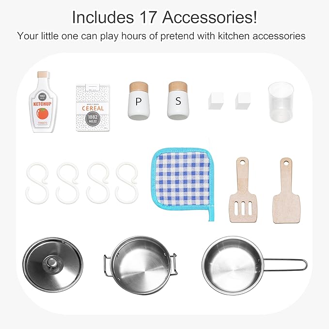 - Safe & Durable for Worry-Free Play: Crafted from premium wood, this wooden play kitchen ensures lasting stability and safe play. This sturdy play kitchen for toddlers is easy to assemble (approx. 30-60 mins) with clear instructions. Rigorously tested to meet ASTM F-963 and CPSIA safety standards, it guarantees physical and chemical safety for total peace of mind.