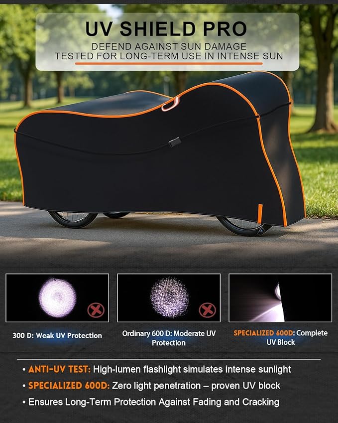- 【Double-Stitched Seams & Reinforced Trim for Longevity】The reinforced double-stitched seams and bright orange edging increase tear resistance and structural durability. Our upgraded trike cover holds up against wind, sunlight, and frequent outdoor use.