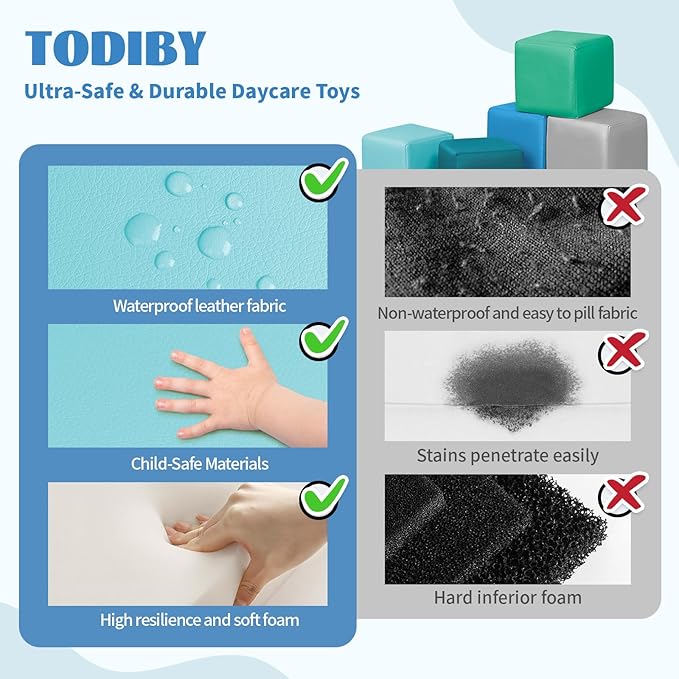 - Ultra-Safe & Durable Daycare Toys: Designed for active little builders! Made with non-toxic, toddler-safe foam and tear-resistant PU leather, these stackable blocks are soft for tumbling and tough for daily play. A hygienic choice trusted for daily toys and preschools.
