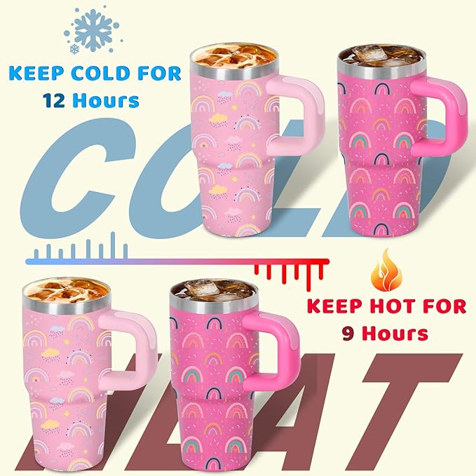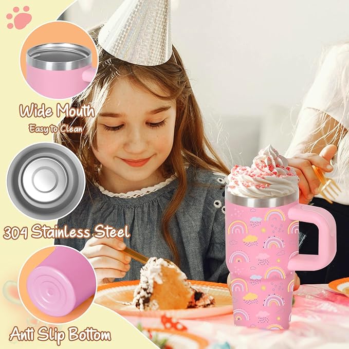 - GREAT INSULATION: The 14 oz kids rainbow tumbler with handle is made of 304 food grade stainless steel. With double wall vacuum insulation it can keep your kids' drinks cold for 12 hours and hot for 9 hours.
