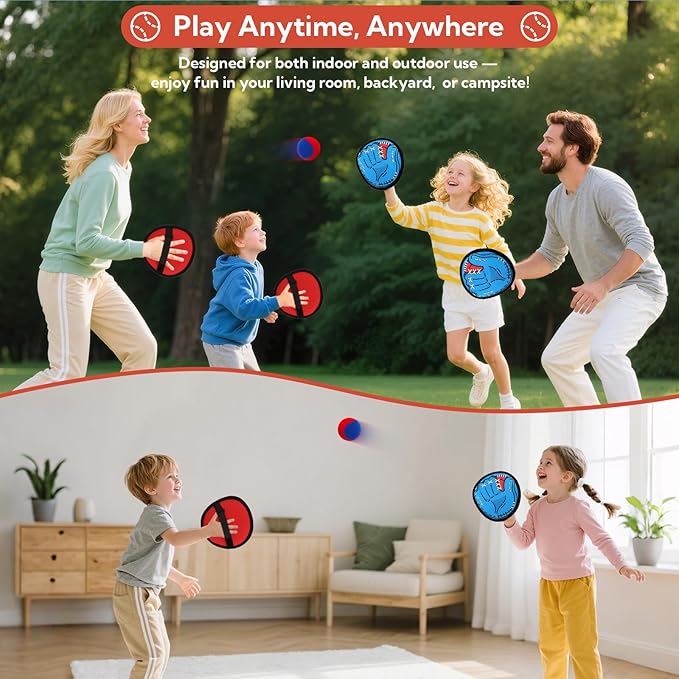 - Bigger Paddles, Ultra-Sticky Catches – Built to Last:Crafted with upgraded EVA material and ultra-sticky Velcro, this set makes catching easy and satisfying for little hands. Inspired by the classic kids baseball glove, it’s soft yet sturdy — safe for small kids, durable for rough play, and made to withstand all your adventures. These are sports & outdoor play toys made with quality and care.