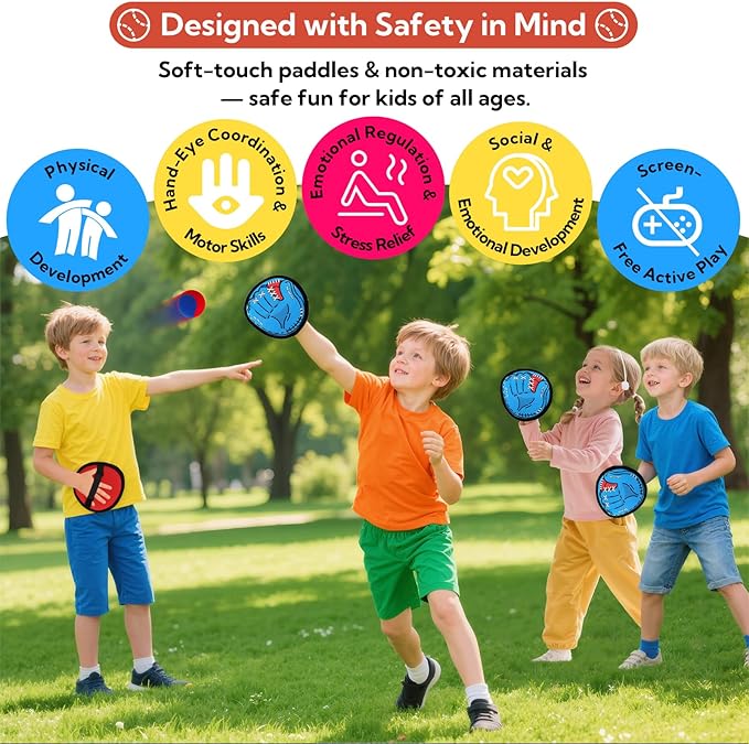 - Fun for the Whole Family – Anytime, Anywhere:This Toss and Catch Ball Game Set for Kids brings endless laughter and bonding moments for families. With 4 soft paddles and 4 sticky balls, it’s a must-have for picnics, pool parties, beach vacations, backyard play, or rainy-day indoor fun. Whether it’s parents playing with toddlers or kids enjoying a friendly match, these kids outdoor toys turn every moment into quality time.