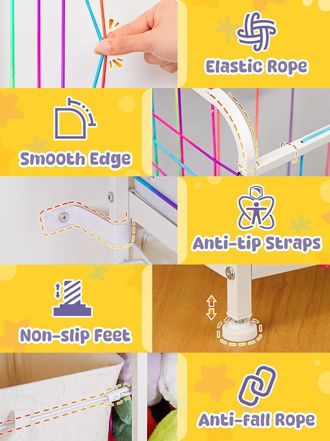 - THOUGHTFUL DESIGN: Made with sturdy materials, smooth rounded edges, non-slip feet, and an anti-tip wall strap, anti-fall drawer rope for extra stability. Every detail of the toy storage organizer is designed with your child's safety and comfort in mind.
