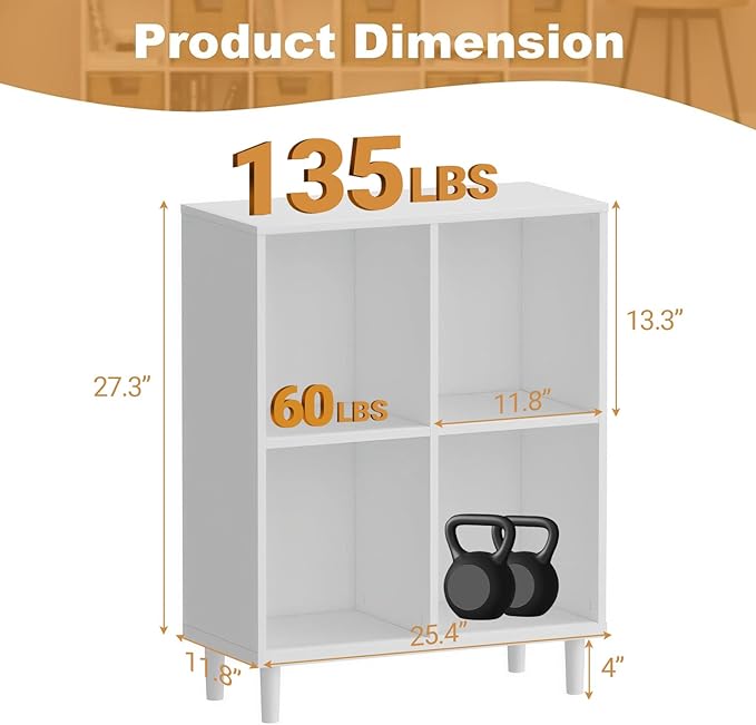 - 1.Sturdy 2 Shelf Bookcase with Spacious Cubes: Each cube of this bookcase is 11.8" L × 13.3" W, made of robust wood. It has ample storage for daily organizing needs. The top shelf of the 2 shelf bookcase holds up to 135 lbs (great for small TVs/heavy decor), and each cube supports 60 lbs (ideal for books, toys, decorations, CDs). Durable material ensures long-term stable use.