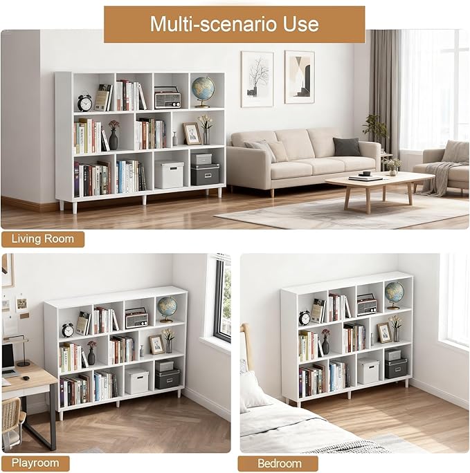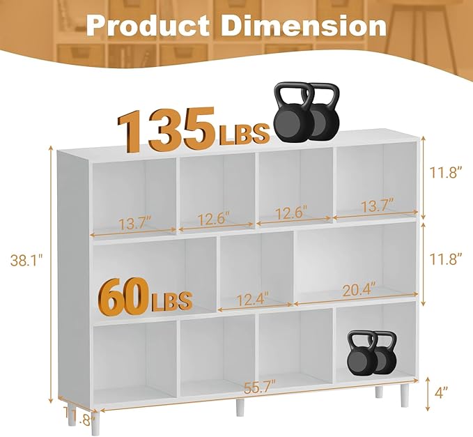 - 1.Sturdy 3 Shelf Bookcase with Spacious Cubes: Each cube of this bookcase is 11.8" L × 13.3" W, made of robust wood. It has ample storage for daily organizing needs. The top shelf of the 3 shelf bookcase holds up to 135 lbs (great for small TVs/heavy decor), and each cube supports 60 lbs (ideal for books, toys, decorations, CDs). Durable material ensures long-term stable use.