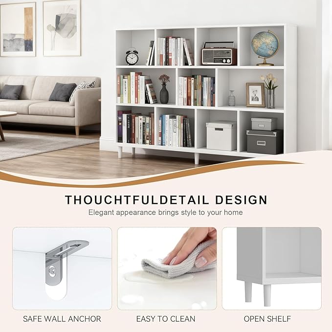 - 3. Versatile Bookshelf for All Rooms: This multi-functional bookshelf is suitable for home offices, living rooms, or foyers. It features multiple grid storage compartments, which can hold handicrafts, decorations, or organize daily essentials. This stylish white bookshelf can also double as a TV stand, linen cabinet, or modern-style shelving unit, integrating practicality with minimalist aesthetics.