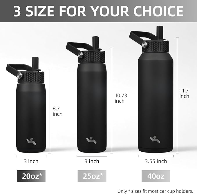 20oz Insulated Stainless Steel Water Bottle with Straw and 3 Lids, BPA-Free Sports Water Bottle,travel water bottle,Black