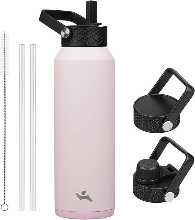40oz Insulated Stainless Steel Water Bottle with Straw and 3 Lids, BPA-Free Sports Water Bottle,travel water bottle,Pink