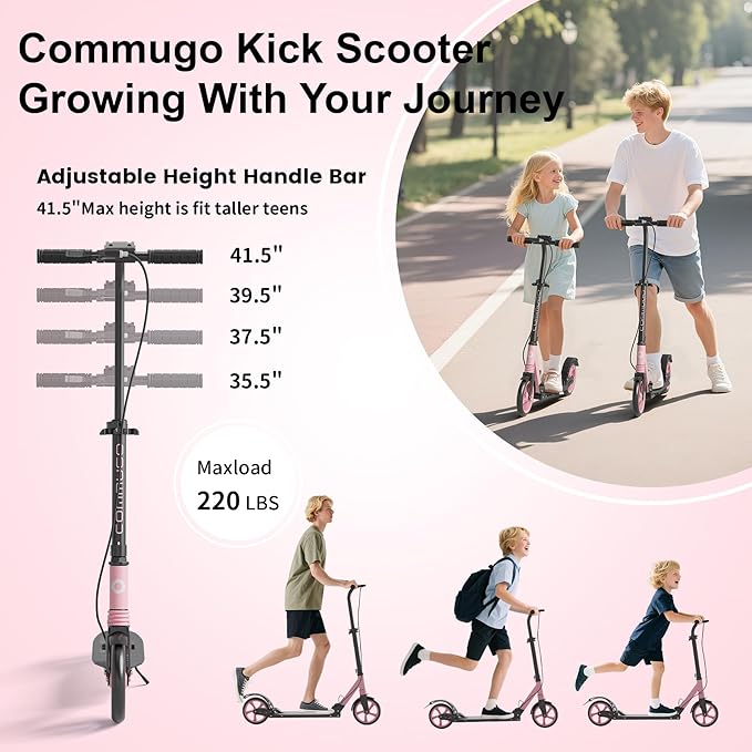 - EXPERIENCE ULTIMATE SAFETY AND COMFORT: COMMUGO adult scooter features dual brakes for reliable stopping power, dual suspension to absorb shocks on rough terrain, and 8-inch big tires for enhanced grip and stability on all surfaces—ideal for commuting, leisure, and light trails