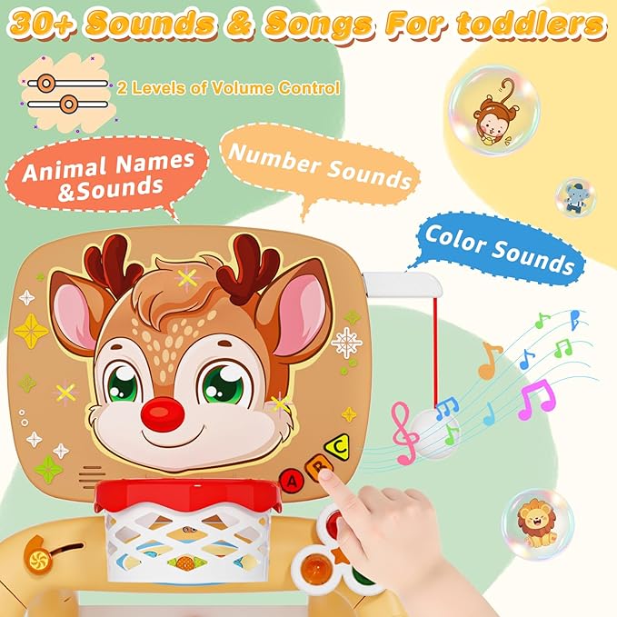 - 【Over 30 Sounds and Songs】Press the ABC melody button to play music. There are realistic animal calls (monkey, elephant, lion), numbers, colors, and more, with over 30 other sounds and music. Inspire your baby to sing along and help them understand cause and effect. When your baby scores a basket, they also receive audio feedback, encouraging phrases, and music. Features adjustable volume levels, Let you to sing along with your baby to giraffe-themed tunes! Note: Requires 3 AA batteries (not included)