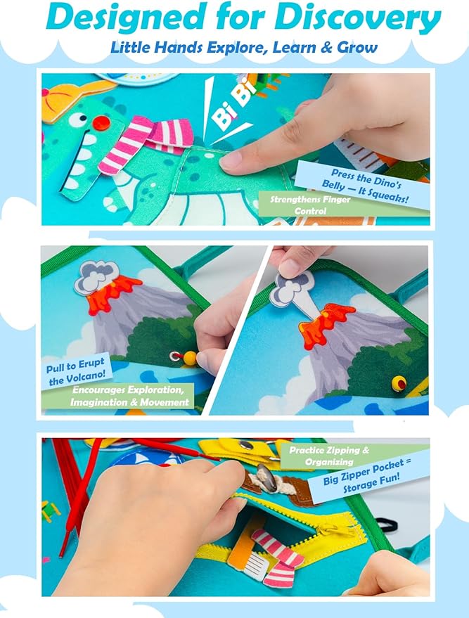 - 【Perfect Gift for Curious Little Explorers】With colorful dinosaurs like T-Rex, Triceratops, and Pterodactyl, this fun-packed busy board book is an ideal 2 year old boy birthday gift, first birthday gift for boys, or Christmas surprise. Loved by boys and girls ages 1–5, it’s one of the most thoughtful Montessori toys, baby books, or busy books for toddlers 1-3 who love dinos and discovery!