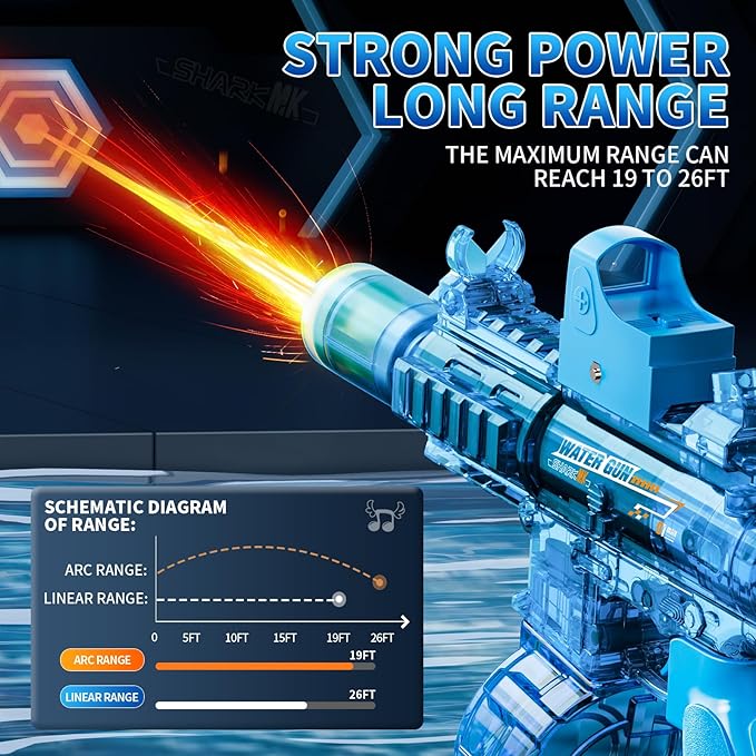 - Long Shooting Distance: Powered by a high-performance electric drive system, this isn’t just a simple squirt toy—it’s designed to deliver unmatched fun! With a straight-line shooting distance of up to 19 feet and a parabolic range that can reach an impressive 26 feet.