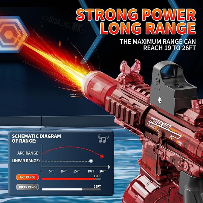 - Long Shooting Distance: Powered by a high-performance electric drive system, this isn’t just a simple squirt toy—it’s designed to deliver unmatched fun! With a straight-line shooting distance of up to 19 feet and a parabolic range that can reach an impressive 26 feet.
