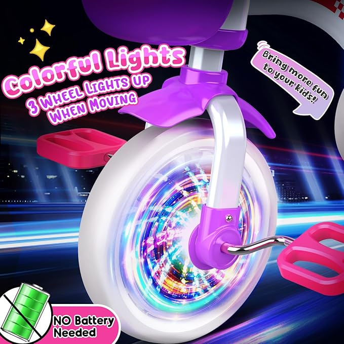 - 🌟【Colorful Lighting Design】: Light up the night, double the fun for your kids! No batteries required, simply spin the wheels to glow. These dazzling lights add an extra layer of excitement to every ride, also improve visibility and increase safety of night rides. Our toddler tricycle is the ideal toys for ages 2-4 kids.
