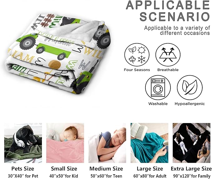 - Size Options: Personalized Tractors Blankets Are Available In A Variety Of Sizes. 30×40 Inches, Toddler Or Pet Available. 40×50 Inches, Kids Available. 50×60 Inches, Teenagers Available. 60×80 Inches, Available For Adults. 90×120 Inches For Family. You Can Choose According To The Size.