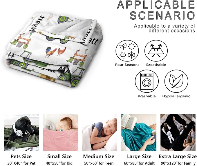 - Size Options: Personalized Farm Tractor Blankets Are Available In A Variety Of Sizes. 30×40 Inches, Toddler Or Pet Available. 40×50 Inches, Kids Available. 50×60 Inches, Teenagers Available. 60×80 Inches, Available For Adults. 90×120 Inches For Family. You Can Choose According To The Size.