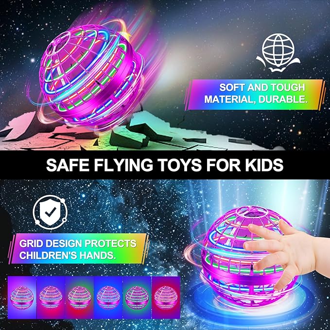 - High-Tech Hand Control Flying Ball: Super cool magic flying ball! After lightly pressing the button,the flying ball needs to be kept vertical in the palm of the hand.The boomerang ball will naturally float when you let go of it. Different throwing angles and speeds will create different flight paths and boomerang effects.If you want to stop the flight, just shake the flying space ball and stop the rotation.For more ways to play with the orb ball, please watch the video on the detailed page