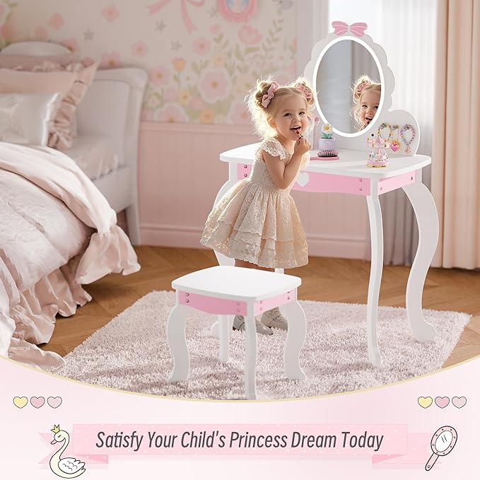 - A Gift She'll Adore – Every little girl dreams of having her own special space to get ready. This vanity set, adorned with a sweet love and bow pattern design, makes the perfect gift for birthdays, holidays, or simply as a thoughtful surprise. It’s a beautiful addition to any bedroom or playroom!