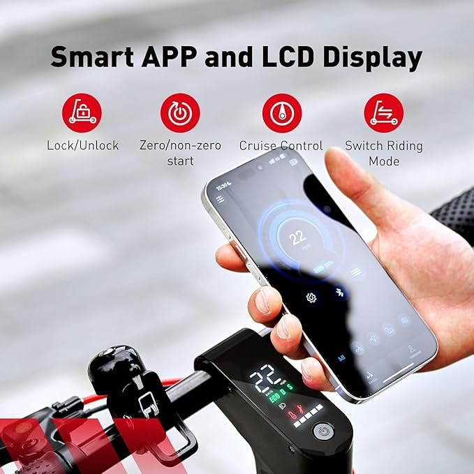 - 【Adjustable Speed Modes】Choose from 9/15/22 MPH with three speed settings to fit any terrain. Paired with the Smart App, you can easily control your speed, track your ride, and customize your scooter settings. Perfect e-scooter for city streets, parks, or open paths.