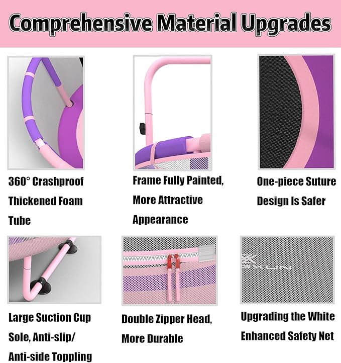 - [SAFETY UPGRADE] LANGXUN 60-Inch Mini Kids Trampoline features a baby fence-style frame structure, a new generation of thickened and heightened safety net with 360° surrounding thick safety foam tubes. The stitched jump mat and protective pad design prevent contact with the springs, ensuring children's foot safety. The large suction cups on the feet firmly grip the ground, providing added stability during play. Suitable for children aged 1 to 8.